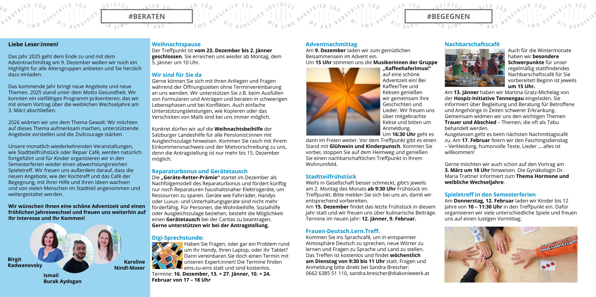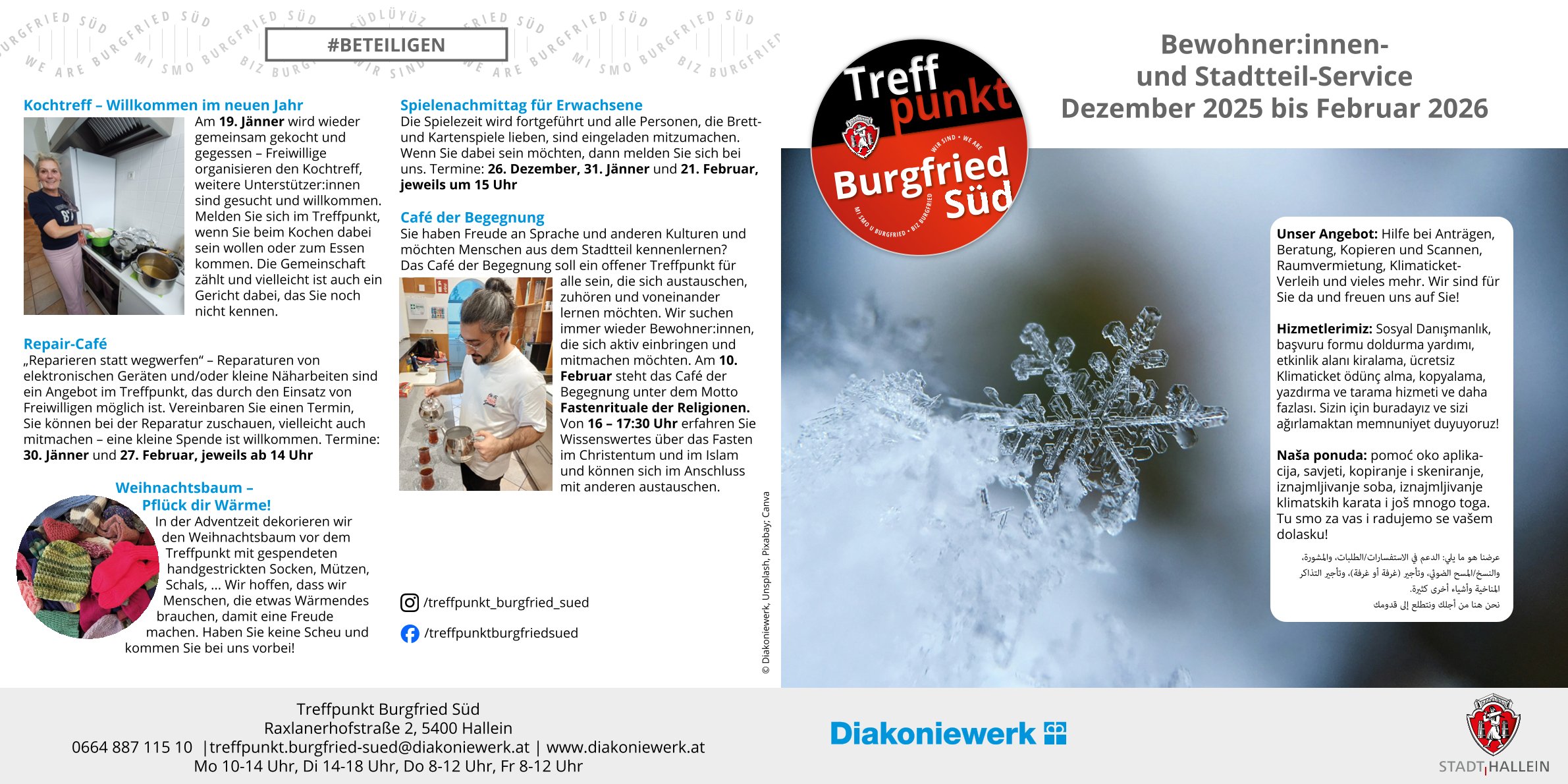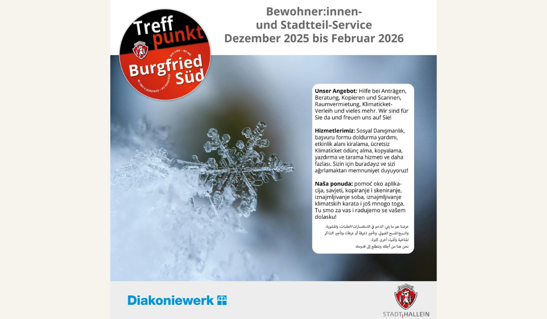 Hier finden Sie das aktuelle Programm mit Veranstaltungshinweisen im Treffpunkt Burgfried Süd, in dem auch bereits die Veranstaltungen der ersten Monate 2026 angeführt sind.